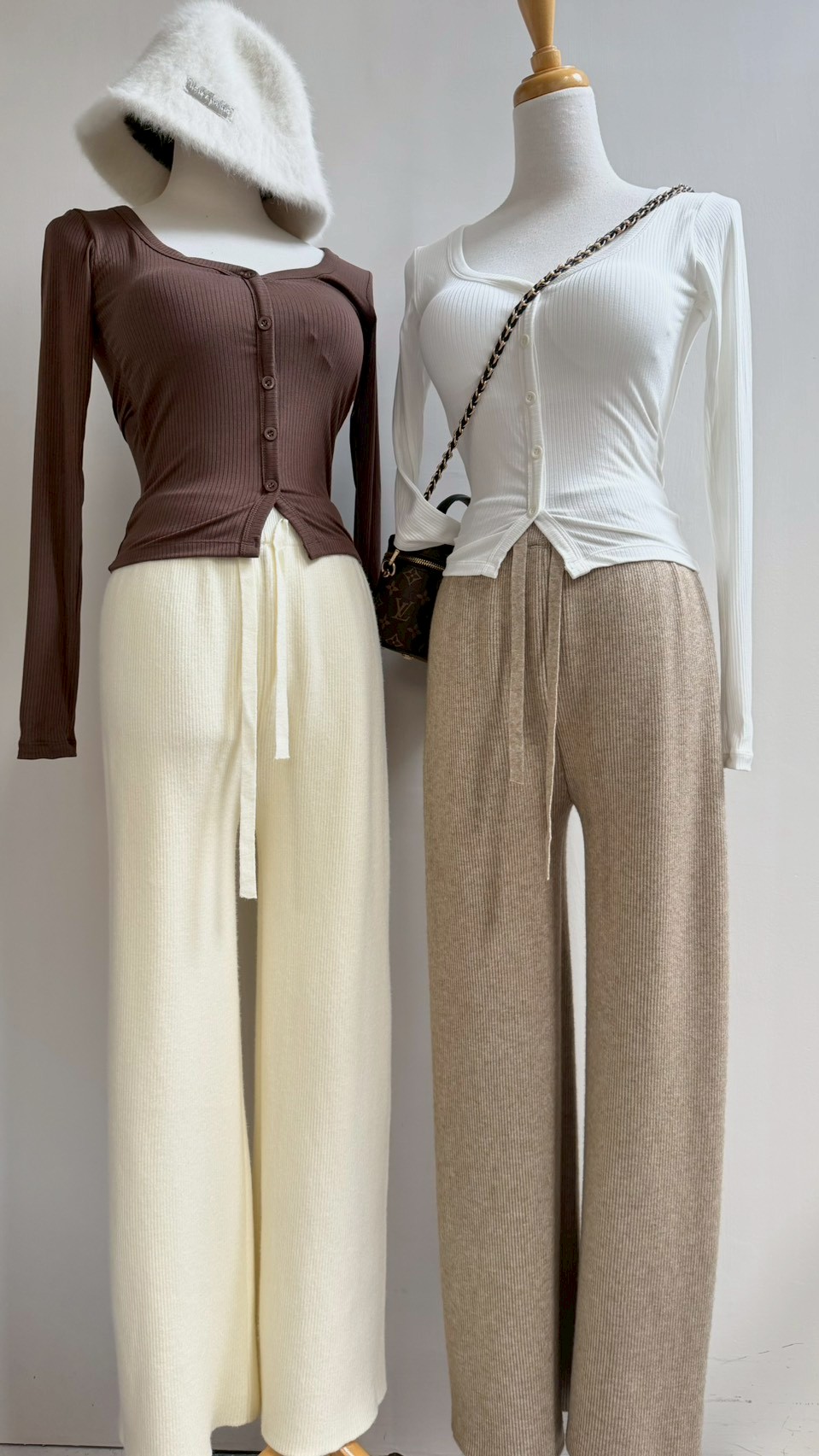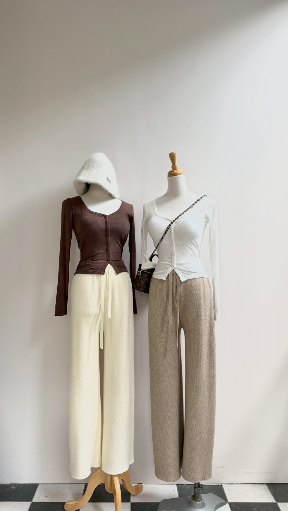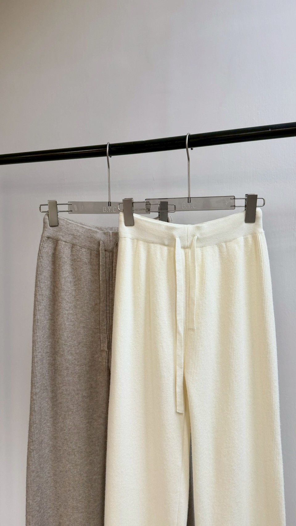 細坑條針織抽繩寬褲 走的是極致簡約的質感路線 擺脫針織褲容易顯胖的困擾,讓下半身線條更俐落。 Color:麥|白