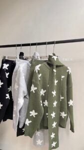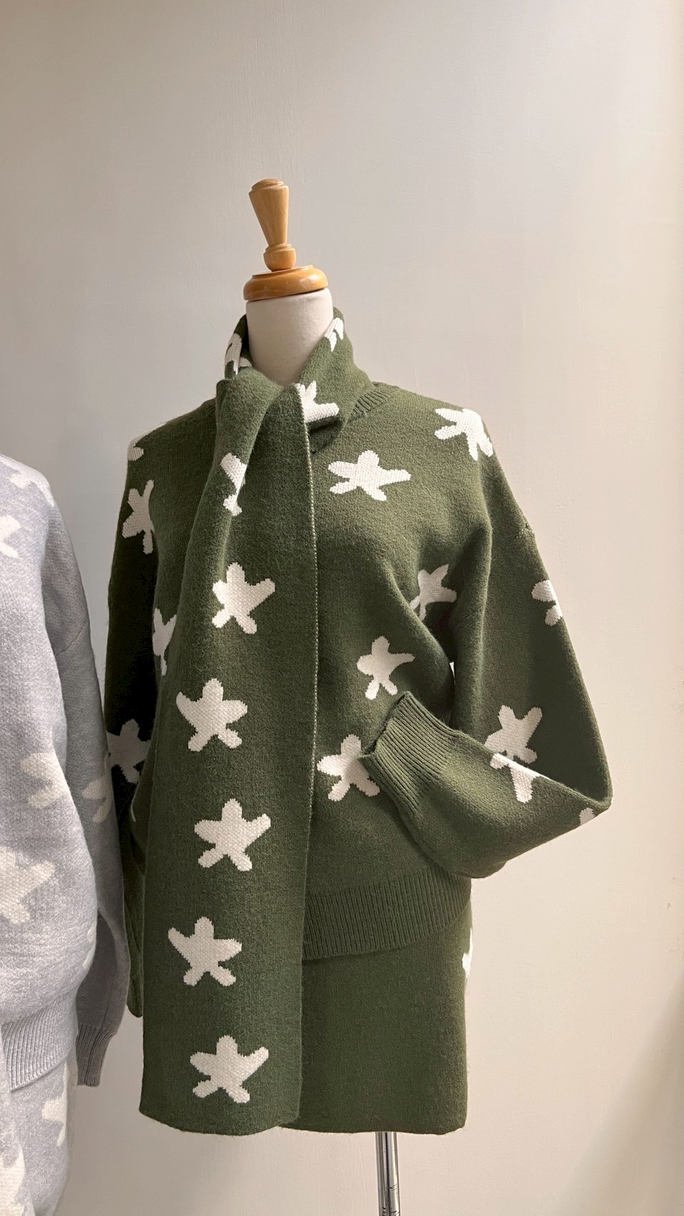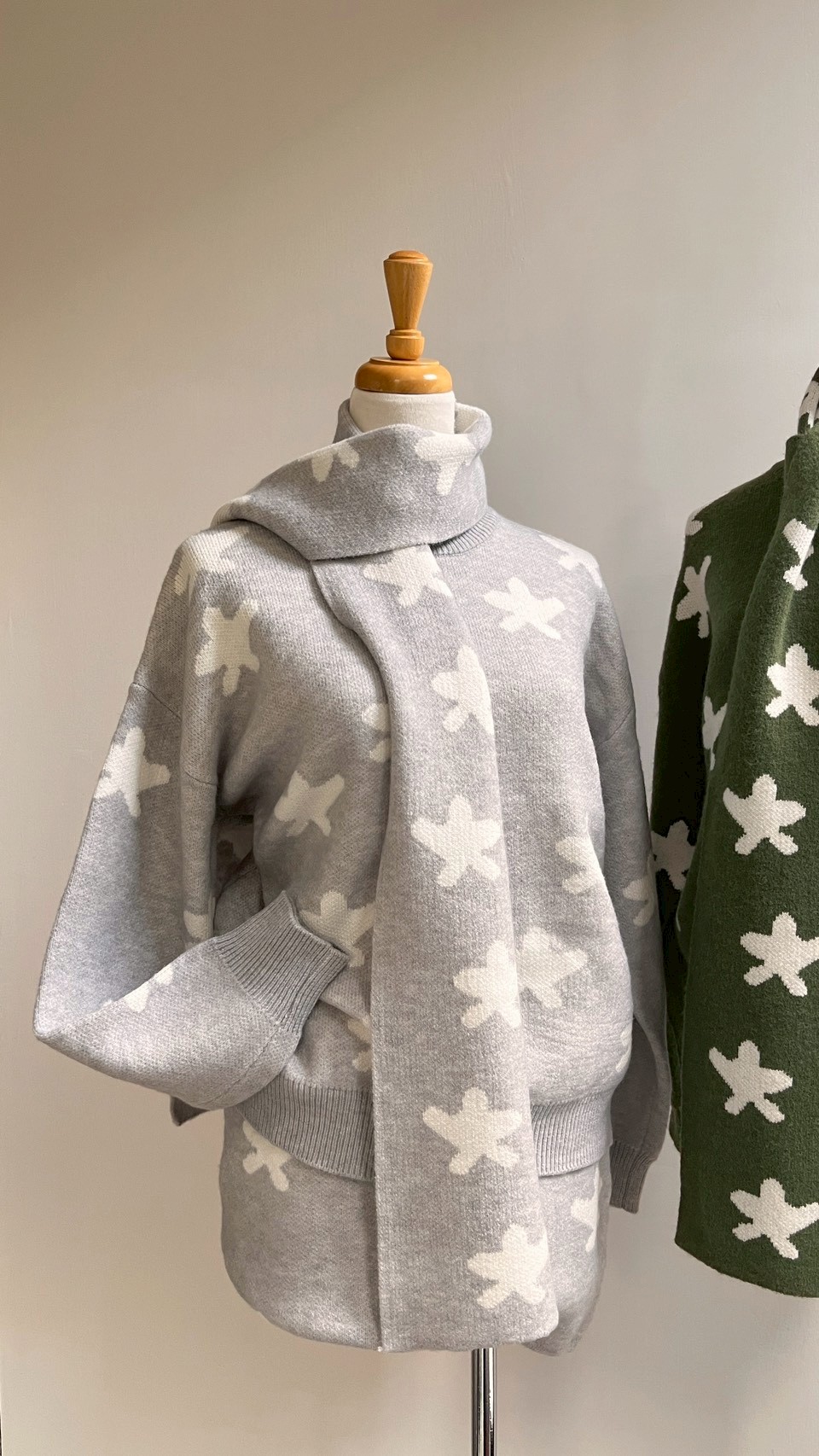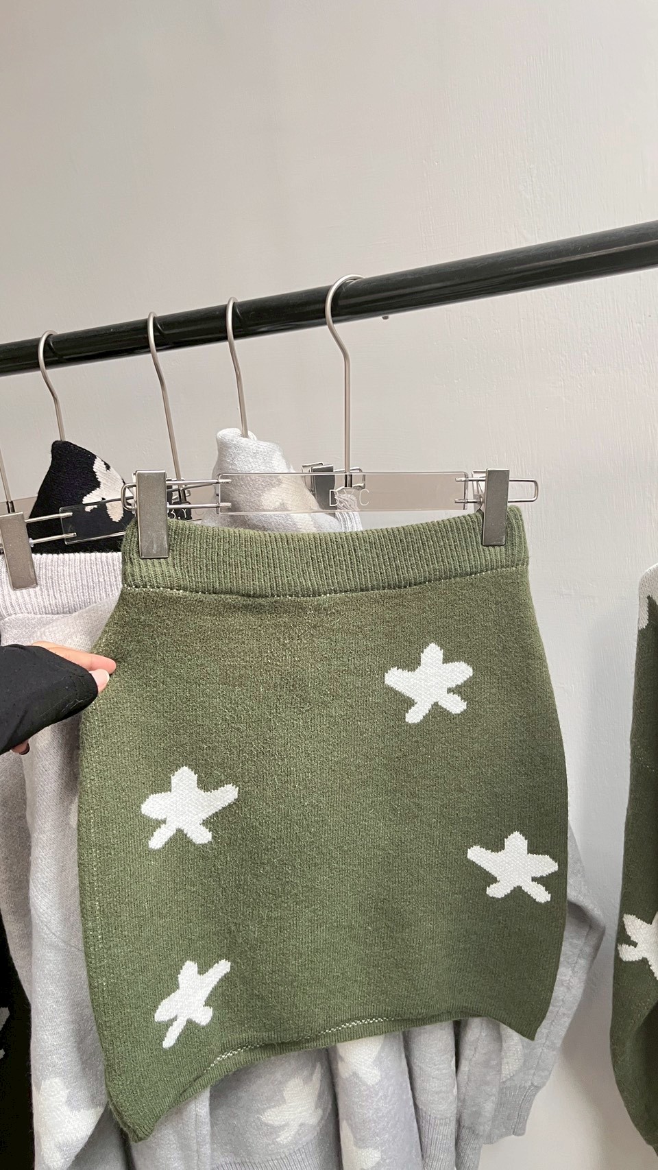12月的初雪心情穿什麼! 柔軟毛呢質地+俏皮星星圖案 **穿上就是冬日的可愛焦點💚 溫暖又舒服的一套裙裝~😌 Color : 黑|灰|綠 Size : Free