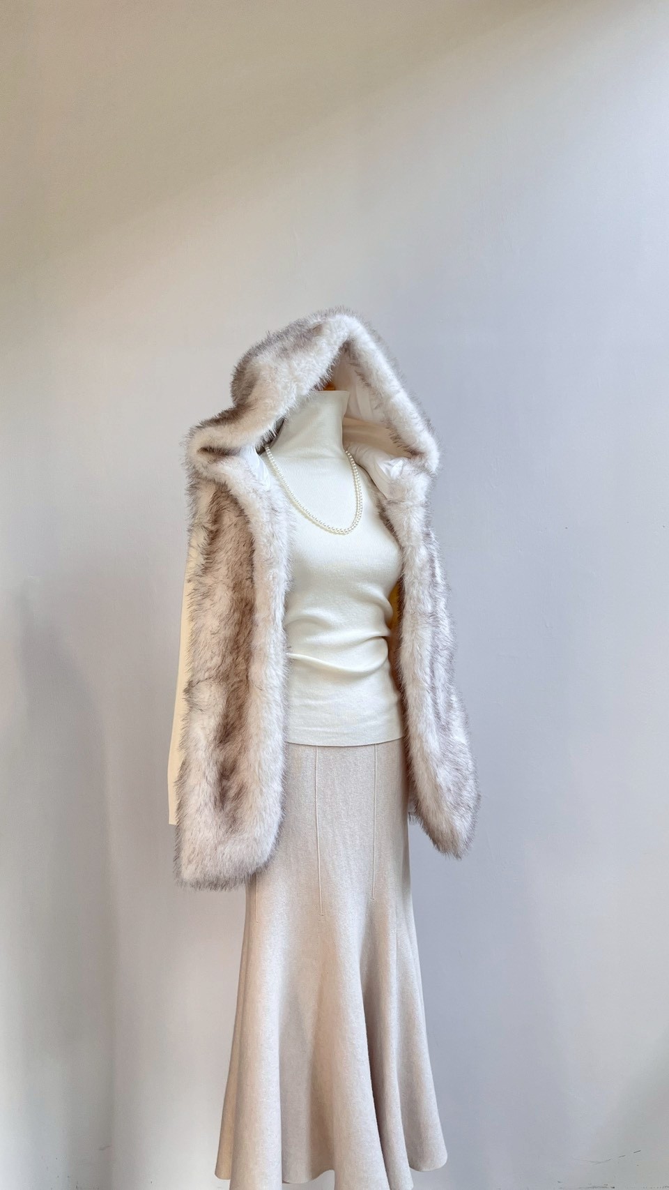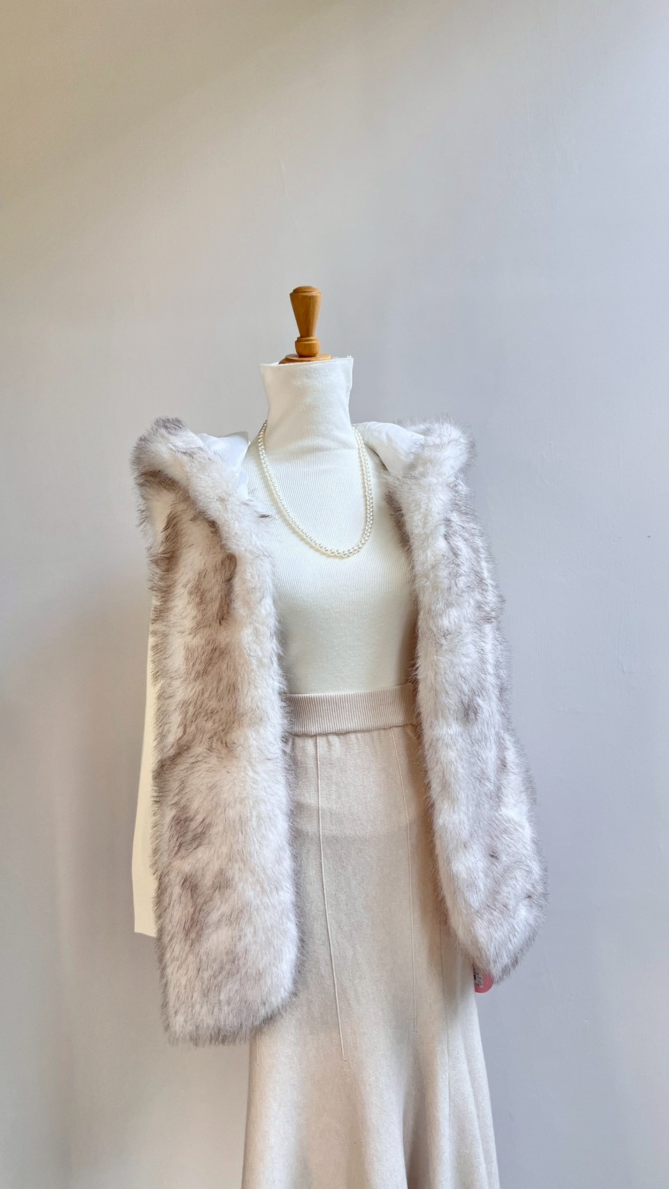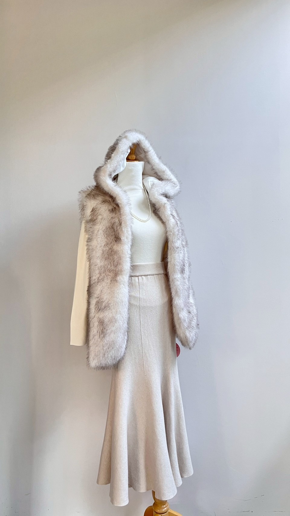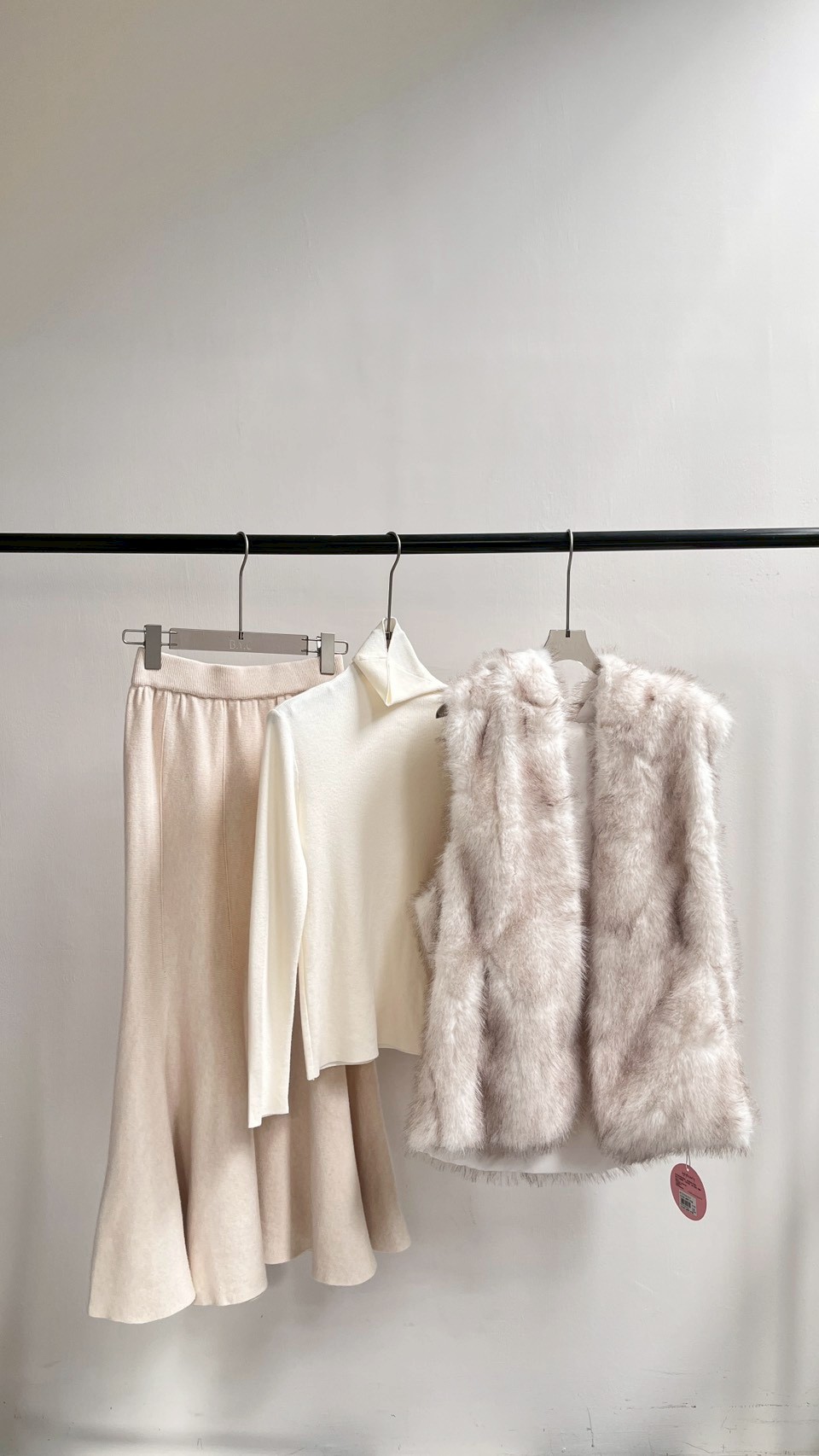 奢華感毛絨背心,手感細膩+貴氣感拉滿。 搭配高領親膚針織與顯瘦魚尾長裙,讓下半身線條更修長,走動時的垂墜感美翻了~
