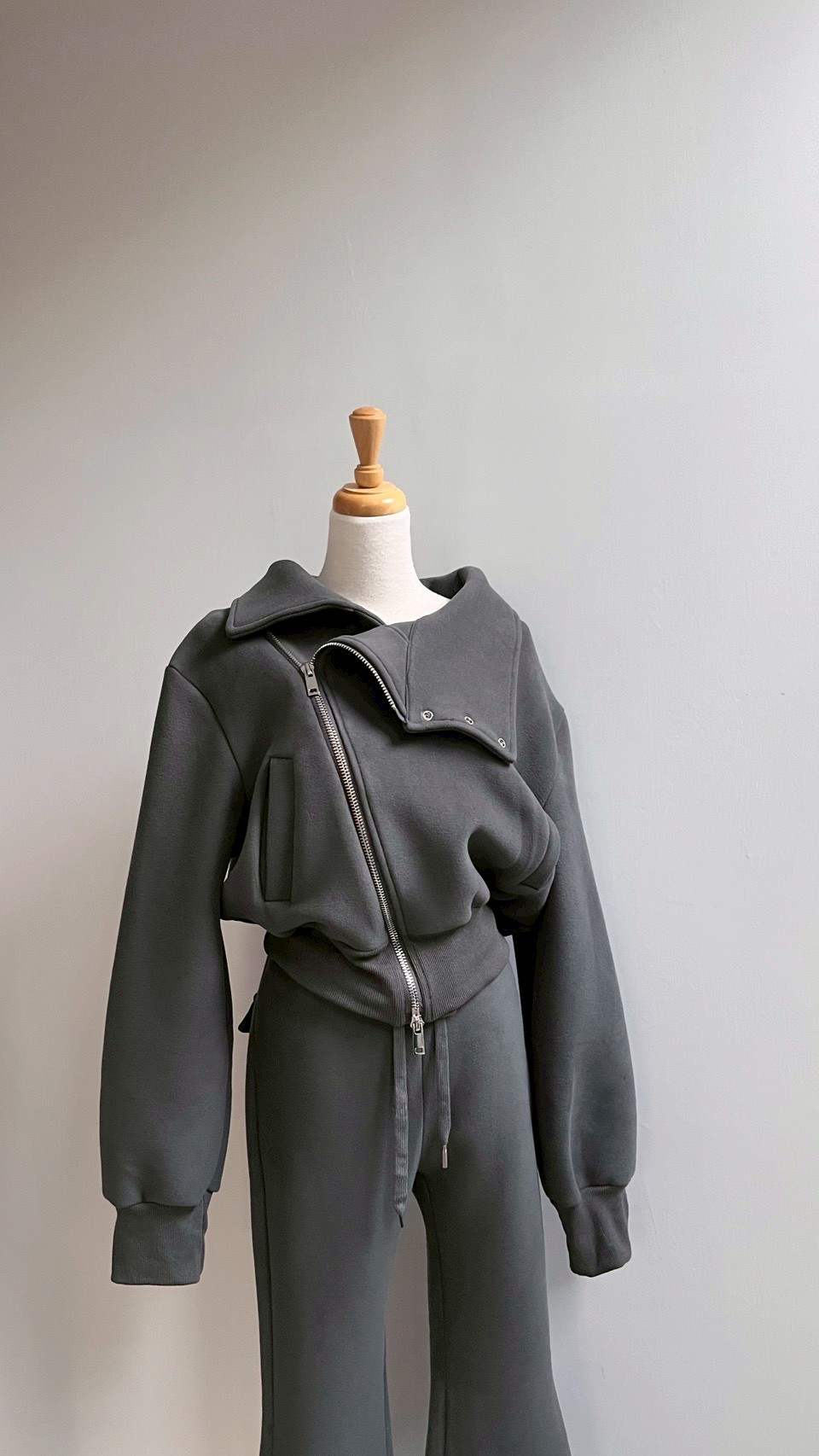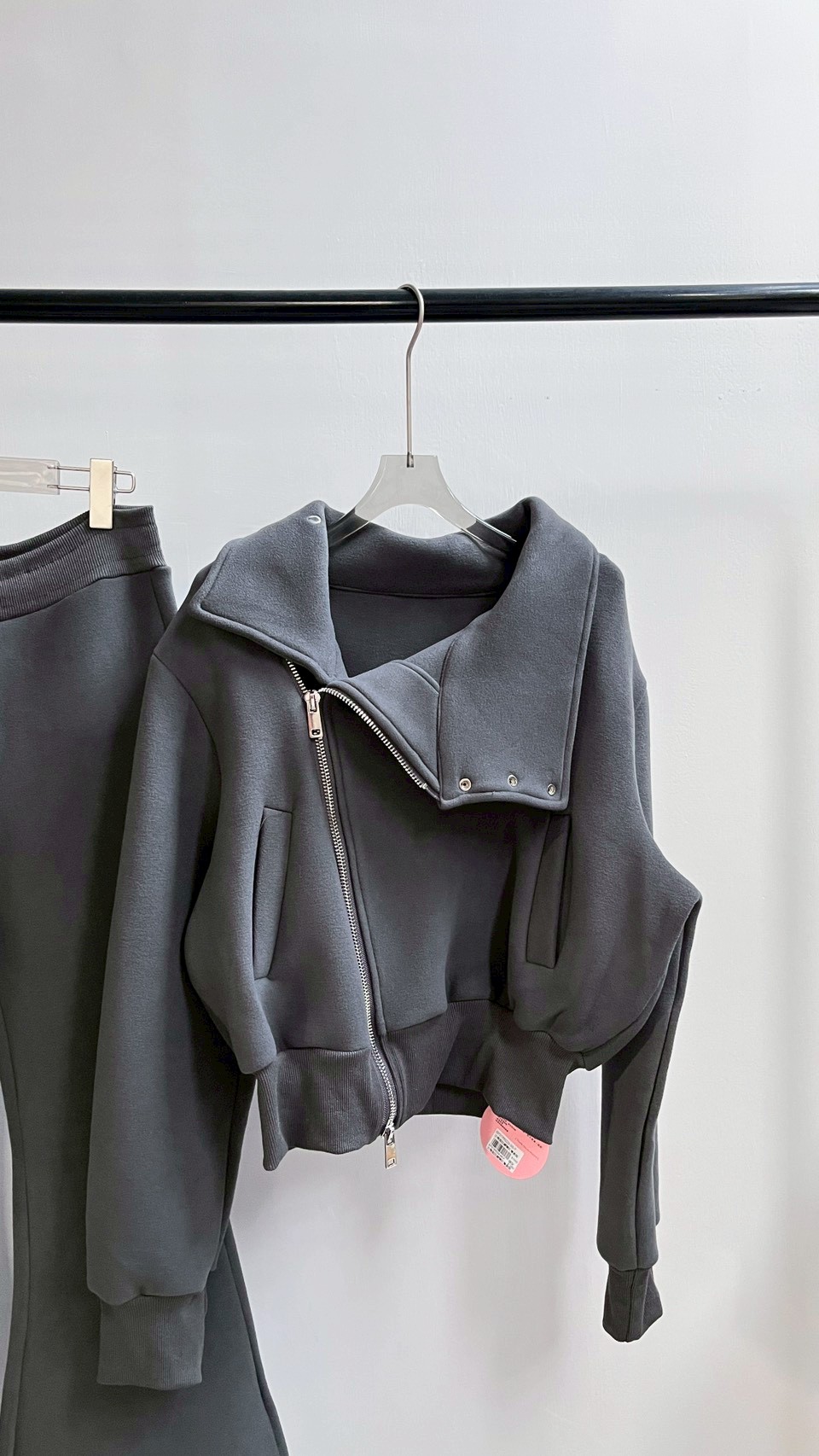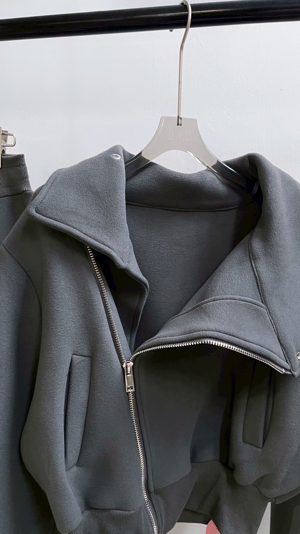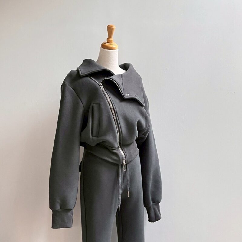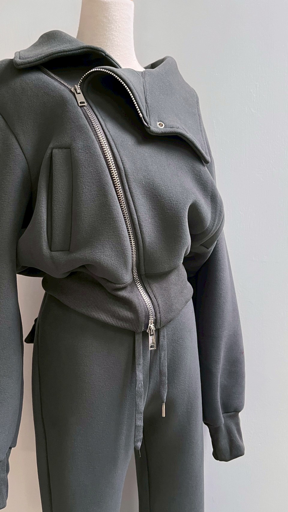 誰說休閒服只能樸素? 這套運用大膽的斜拉鍊、立體翻領設計 讓妳即使穿運動服也能成為街頭焦點! Color:碳灰 Size : Free