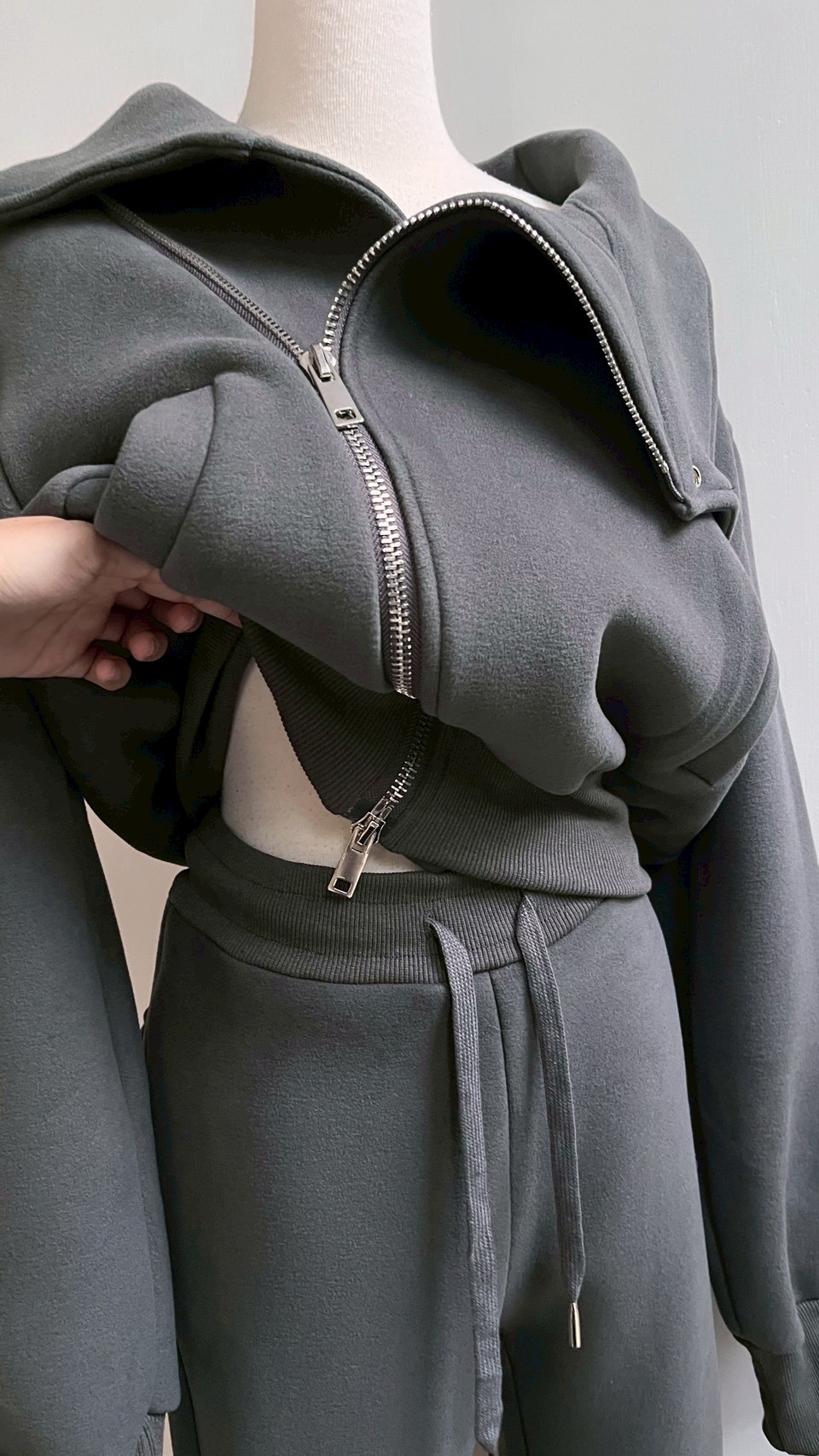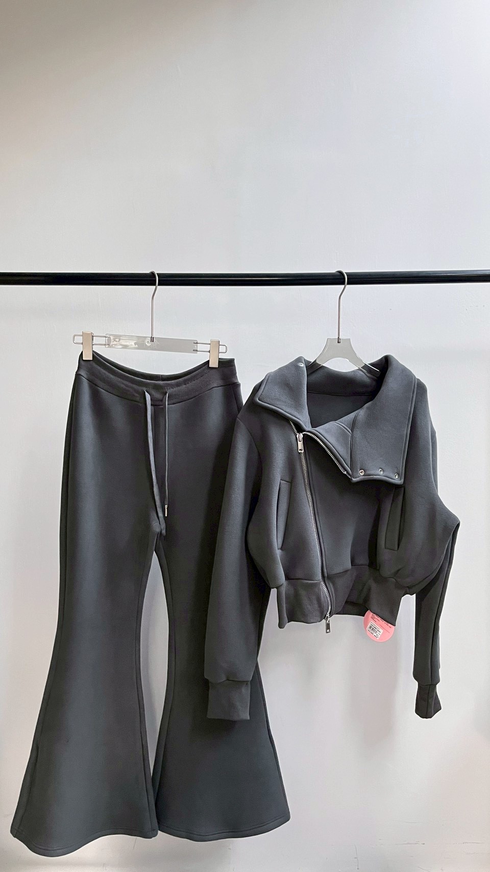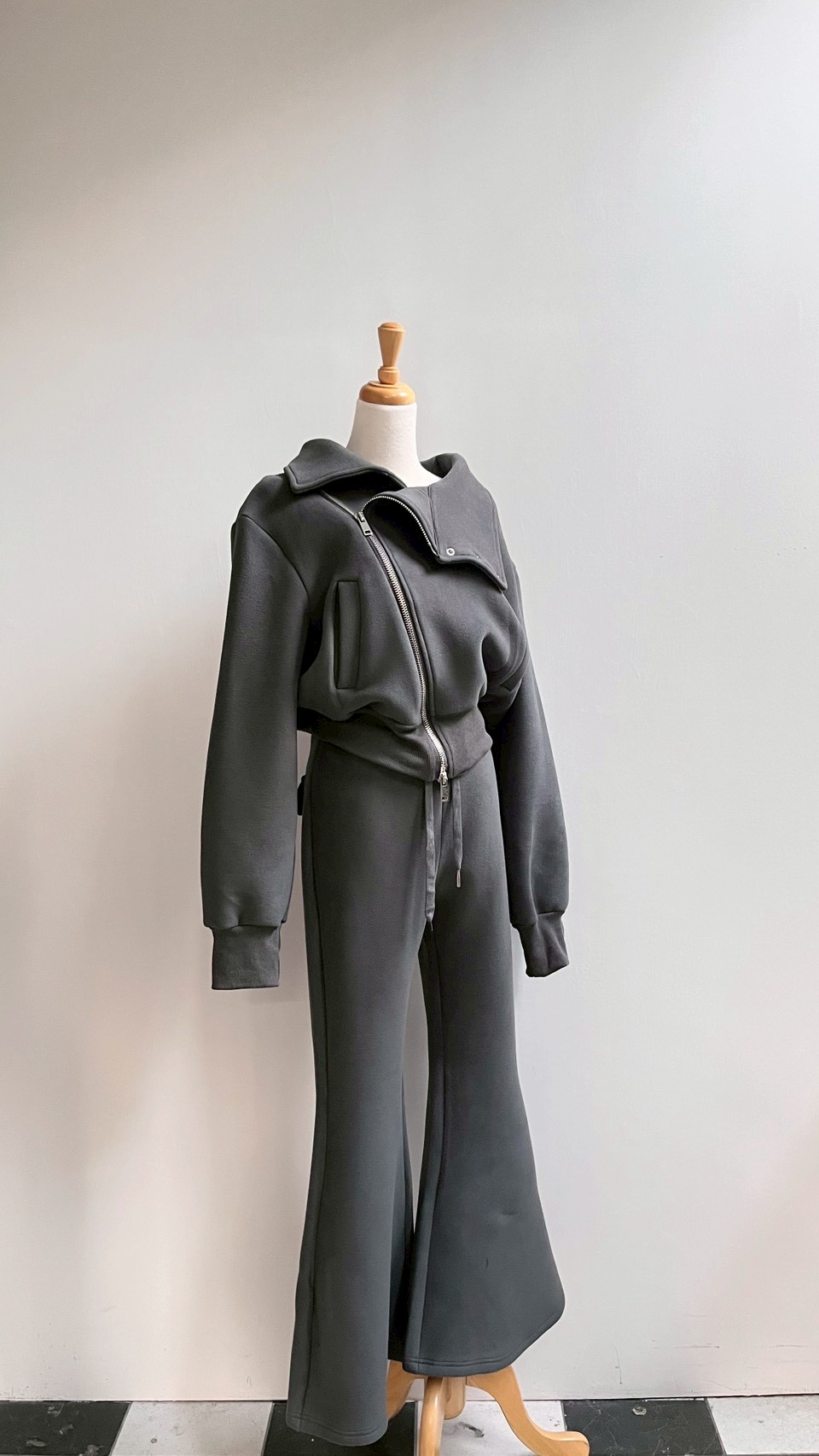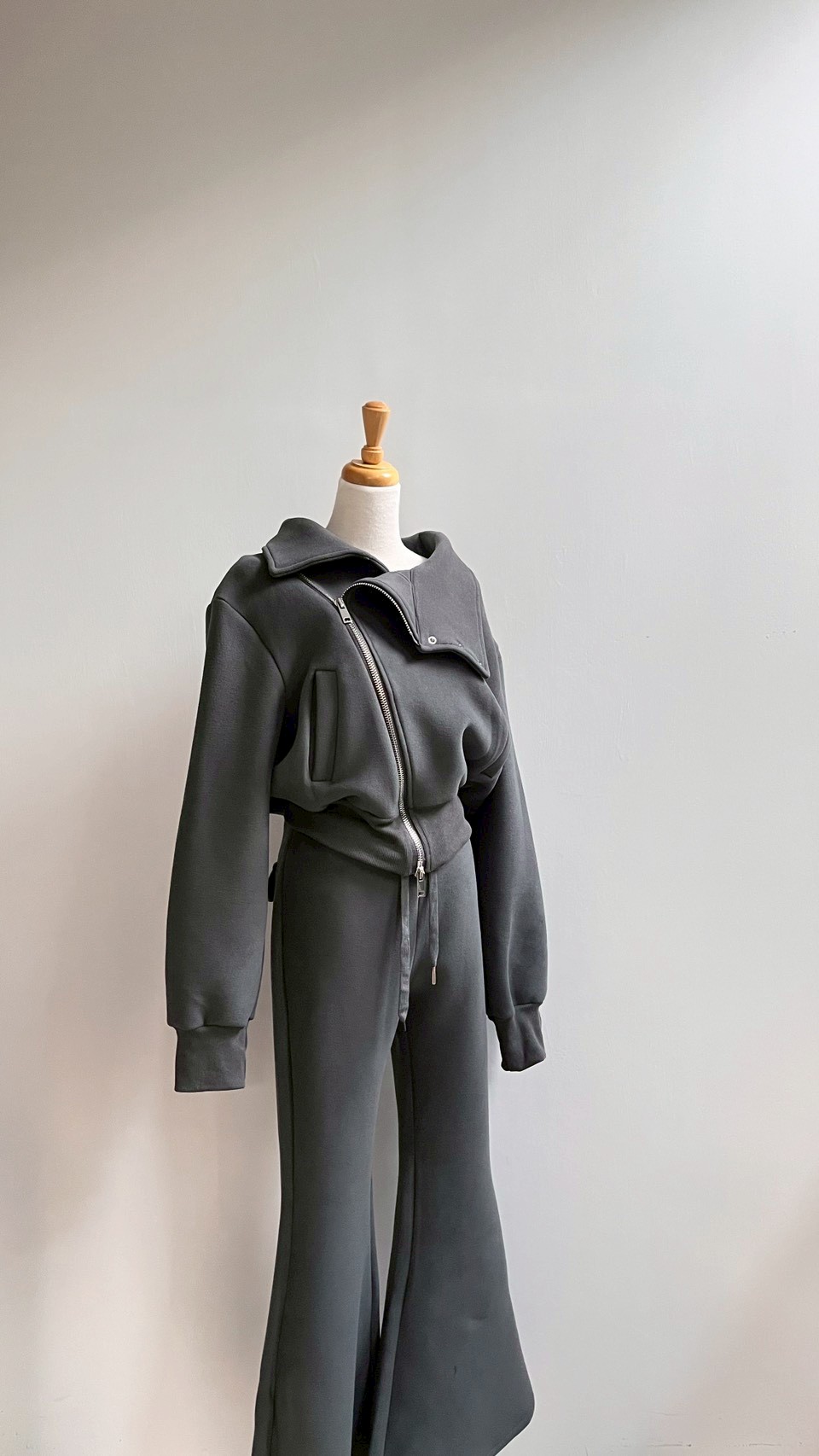誰說休閒服只能樸素? 這套運用大膽的斜拉鍊、立體翻領設計 讓妳即使穿運動服也能成為街頭焦點! Color:碳灰 Size : Free