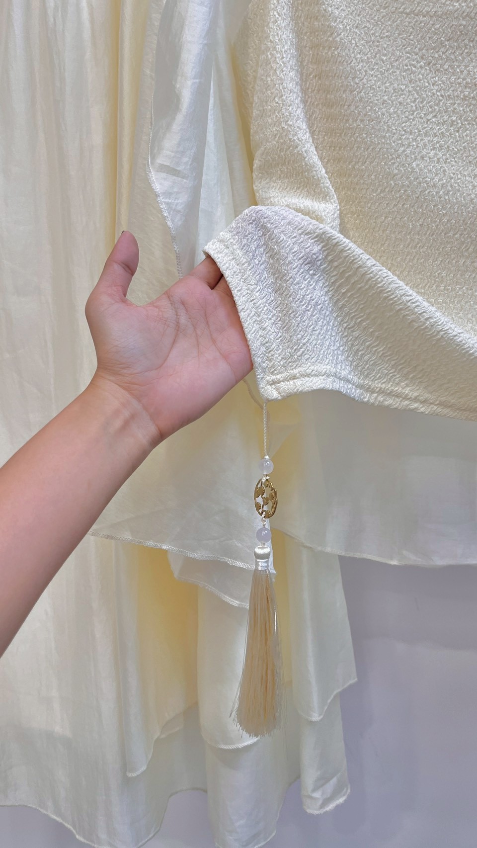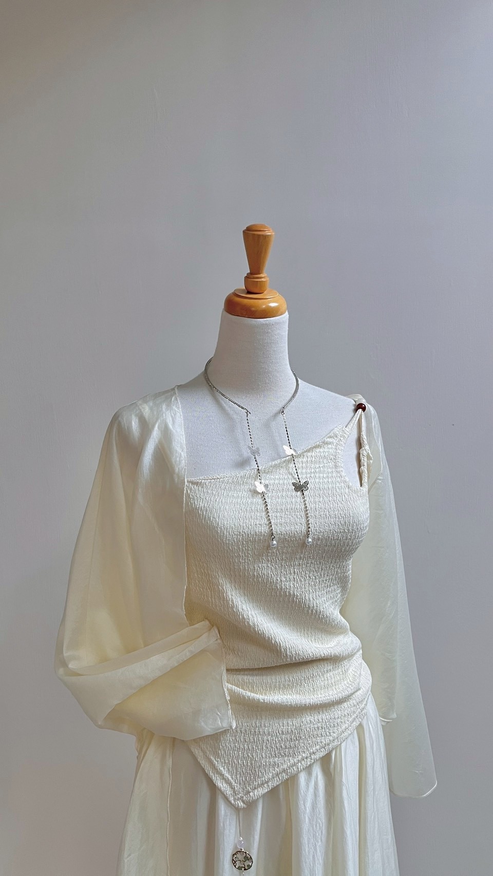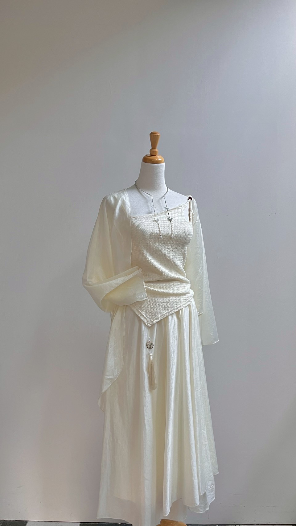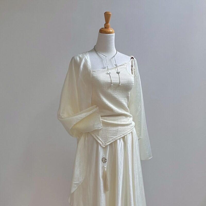 輕薄雪紡紗與歐根紗面料,打造多層次的夢幻視覺效果。 中式禪意美學的微古風套裝 Color:混色 Size : Free