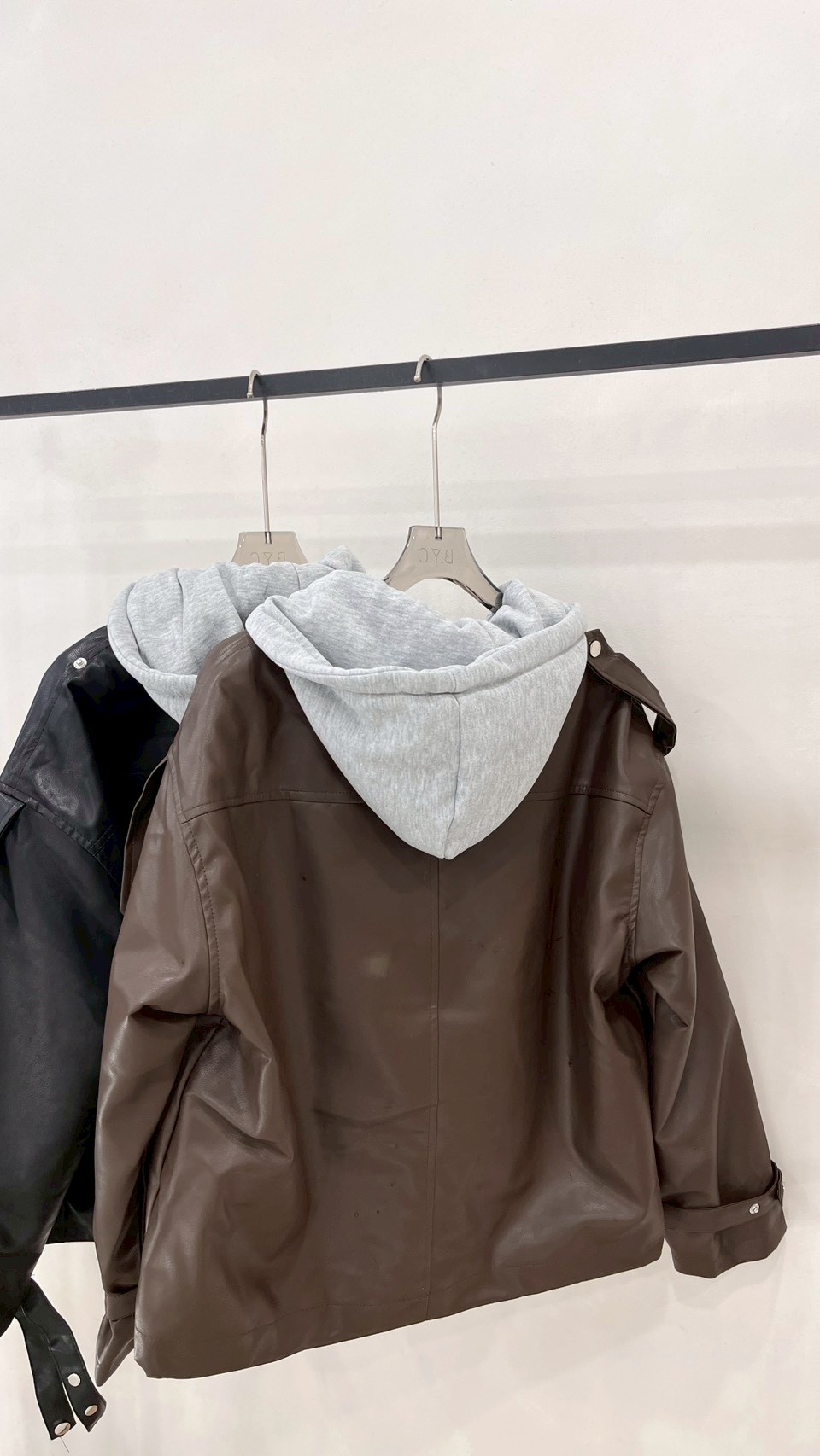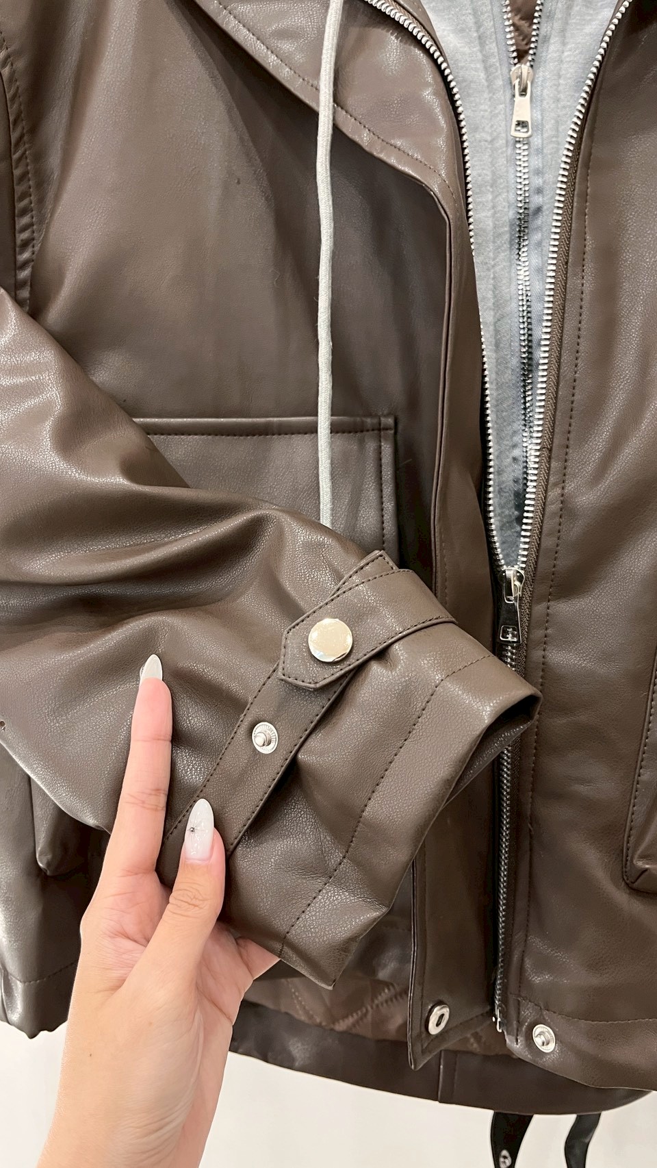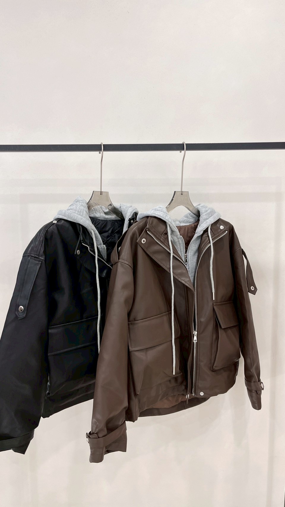 兩件式拉錬設計、裏面棉質帽T+外接皮革外套、下擺抽繩功能。