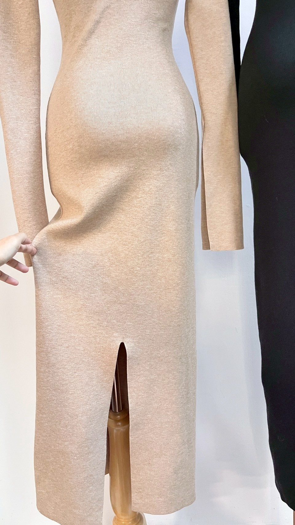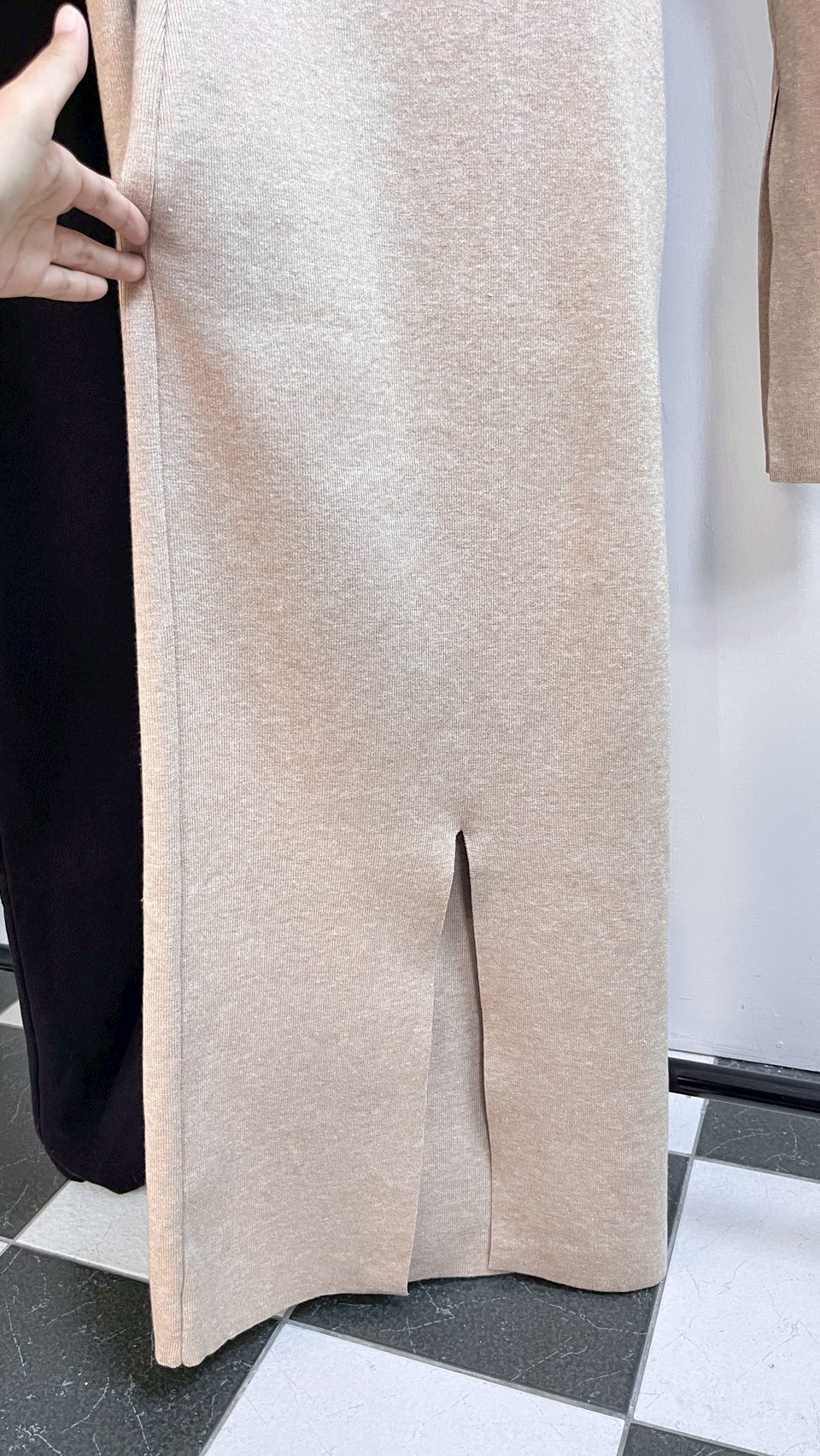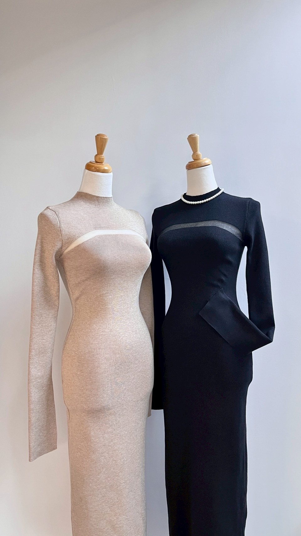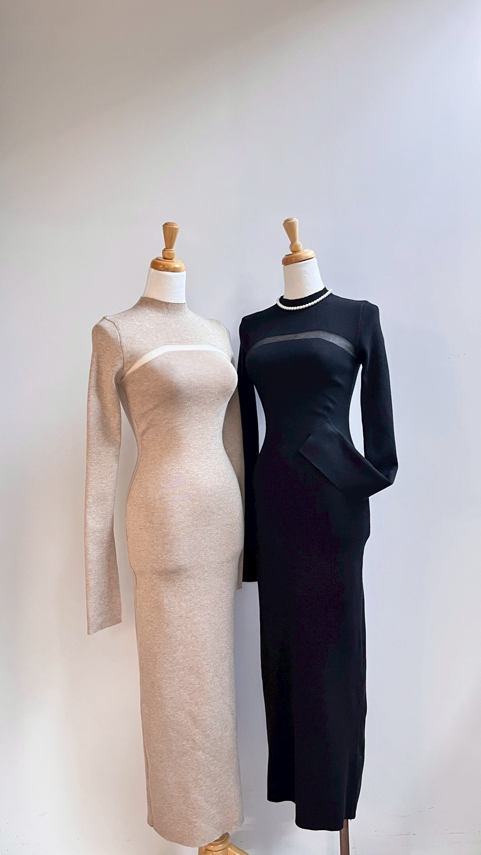極簡美學中的微辣細節! 胸前透紗橫條平衡了高領厚重感,搭配袖口與下擺開岔設計,讓低調質感中滿溢現代時髦與小性感。